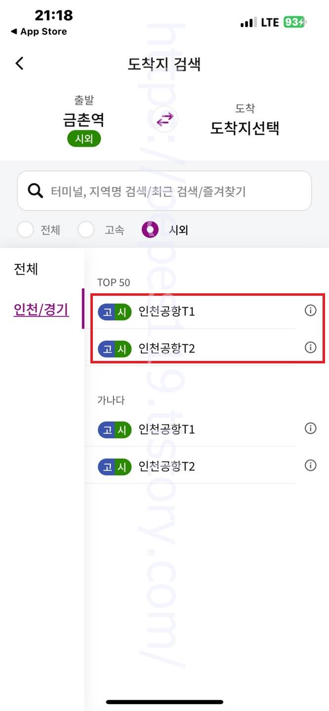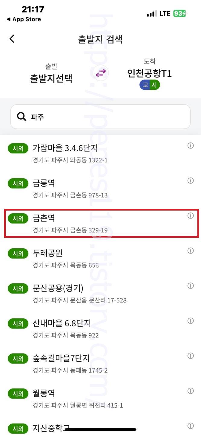 출발지 검색 화면으로 넘어오면 파주 검색 후에 이용할 정류소를 선택합니다. 그리고 도착지 검색 화면으로 넘어오면 인천/경기 목록에서 인천공항T1, 인천공항T2 중에 이용할 정류소를 선택합니다.