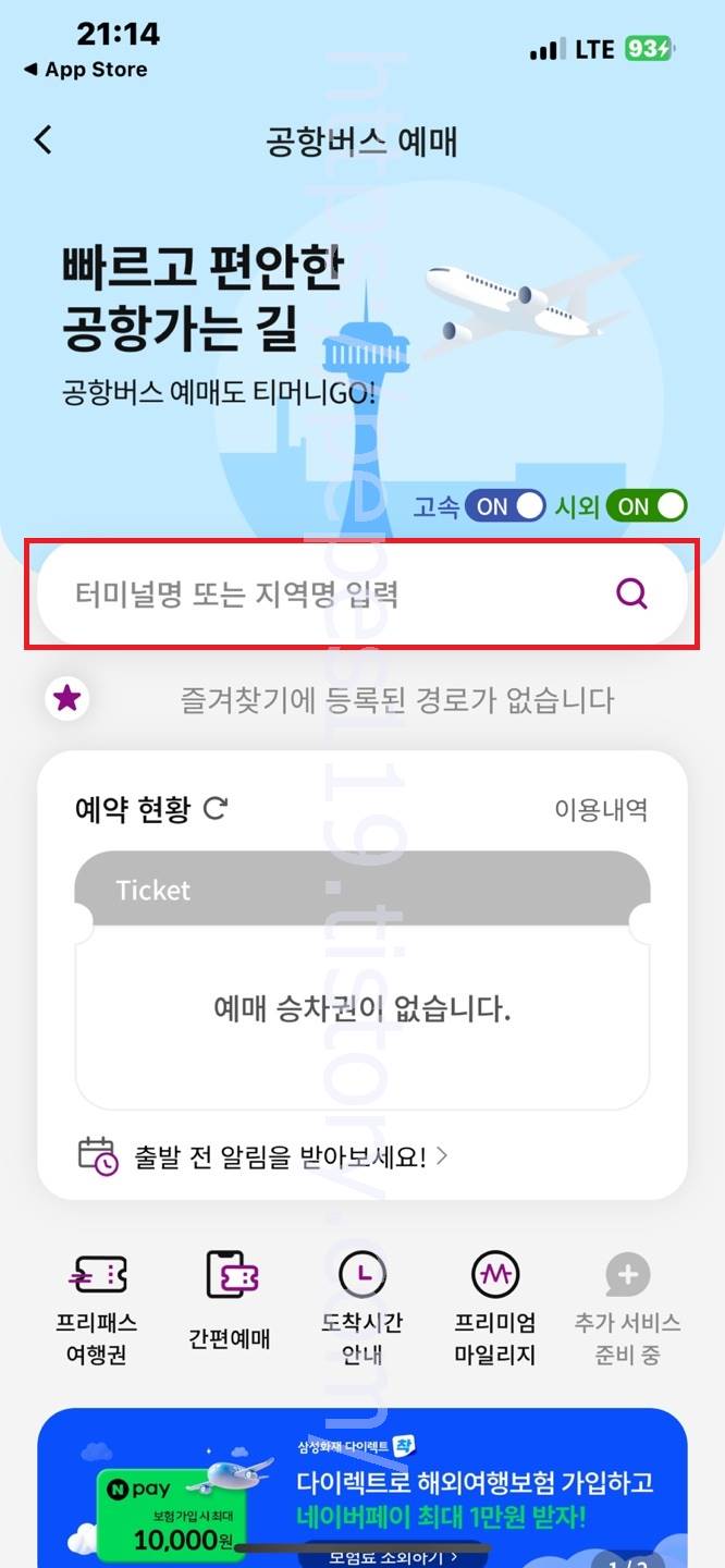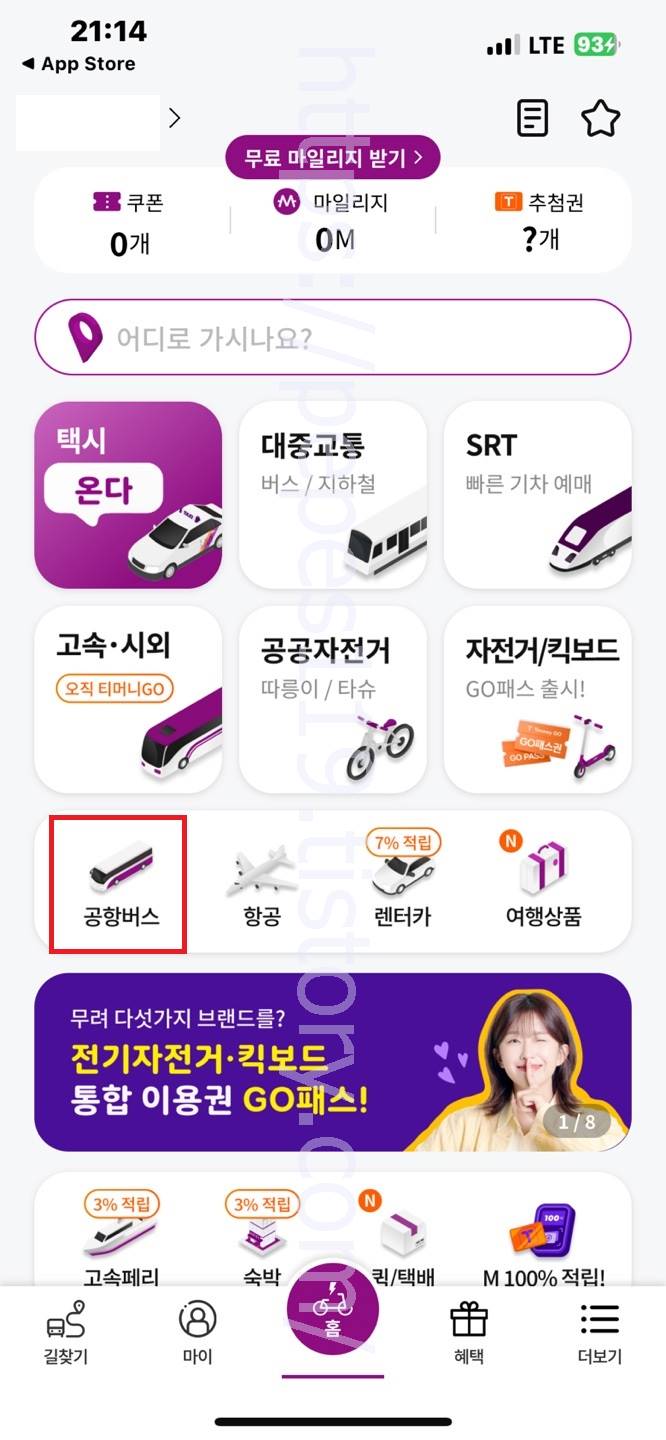 티머니고 앱 페이지로 넘어오면 회원가입 및 로그인을 진행하고 공항버스 버튼을 눌러 들어가 줍니다. 그리고 터미널명 또는 지역명 입력 버튼을 눌러 들어갑니다.